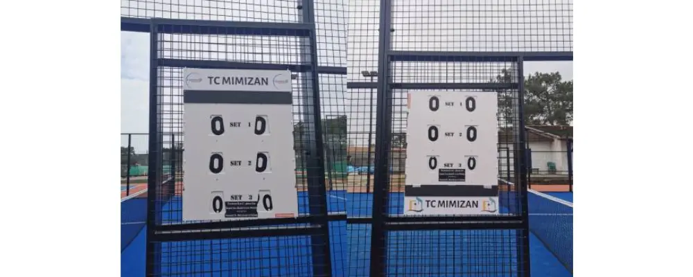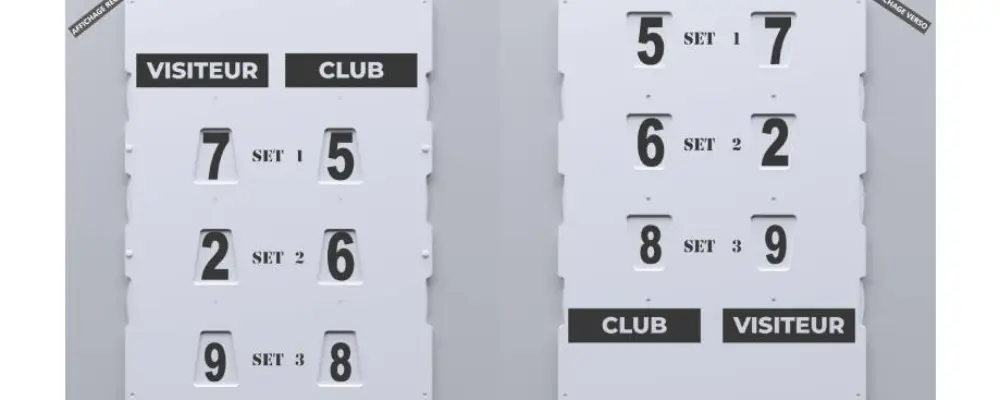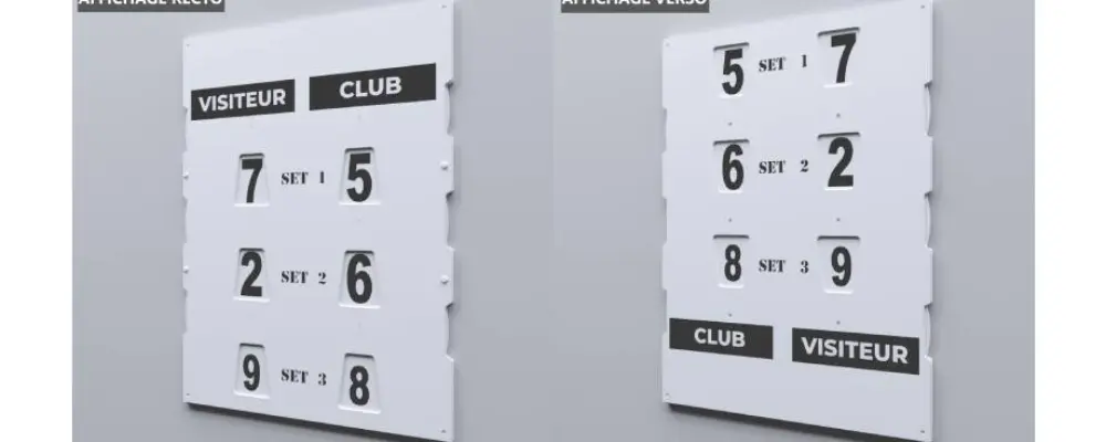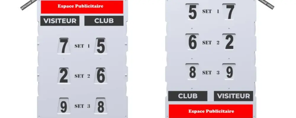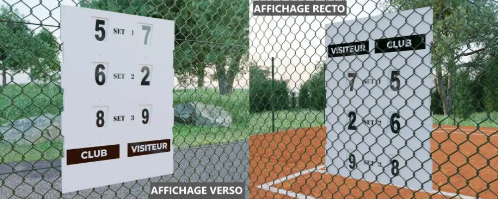 Tennis Scorer is a French company, producing manual tennis scoreboards for 20 years now. Designed by a tennis fan who also was a club's member, they offer, from their origin, perfect answers for basic informations on the tennis courts: • Who plays? • What are the rankings of players? • and above all .... WHAT IS THE SCORE? Leader in Europe with over 16 000 courts equipped in more than 3 000 clubs, the success of its products is due to the combination of all the interests: Advantages for the players • No more forgotten or disputed scores: the players post the scores when they change sides (2 seconds every 2 games). • The players free their minds and are able to concentrate completely on the game. • Having the score and their names displayed on a board on the big day will increase players' motivation and their participation in the game. Advantages for the spectators • Our scoreboards allow the spectators to immerse themselves in the action straight away, the state of play becomes clear immediately. • Thanks to the scoreboard, visitors quickly become spectators, and then supporters. Moreover, it is a well-known fact that supporters have the power to encourage the players, often spurring them on to excelling themselves. Advantages for the clubs • For all the clubs, recognition/fame increases the quality of ones equipment: this product is clearly an additional asset for them. • Made from top of the range material, hardwearing, non-changing and always in a perfect condition, whatever the weather, the score boards add value and prestige to any tennis court. • First class advertising opportunity; the financing of a score board could (should) be undertaken by one of your sponsors. Better still, net profit is possible through the sale of the space during the first one or two seasons of use ! • The advertisement panel on the board could conceivably be used to display the number of the court or the club’s logo (through the use of adhesive figures). • Finally, the scoreboard is an excellent teaching aid for children learning about the games and sets scoring system used in tennis. Advantages for the umpires • Simply reading the scoreboards allows the umpire to gain precious time during tournaments. In numerous clubs one is also able to see the scores for other courts at the same time. Advantages for the sponsors • With the scoreboards, you can have your name or logo permanently showing on the tennis courts in your area or community. You are also positively contributing to the community's sporting life and its sport clubs, as well as giving a community spirited image to your company. • Prime location : the players especially, but also the spectators will memorise their brand because their attention will be continually focussed on the scoreboard in order to follow the match. • The rapport between Cost of an Advertisement / Its life expectancy is incomparable. In effect, the latter is unlimited. Advantages of use • Easy to install and easy to use, the boards can stay outside indefinitely, without damage. • Legible from a 50 metre distance. • Automatic framing of the figures. • Their compact, protected format guarantees their silence and their total immobility : even in strong winds, the players will be in no way distracted. (It is however necessary to attach them securely to the framework by using the fixtures provided. • RESTRICTIONS OF USE: None......as long as it's not used as a target!
